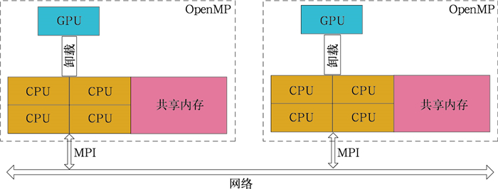 图 1 支持GPU卸载的OpenMP和MPI混合架构 Fig. 1 Hybrid OpenMP and MPI architecture with GPU offloading support |