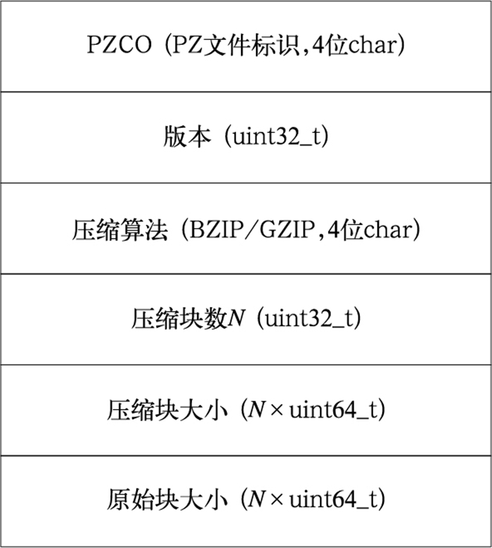 参考现有的技术, 要并行化压缩过程, 同时需要兼容未来优选的压缩算法, 本文设计了一种存储格式命名为pz格式, 以pz作为后缀名。在压缩的方式上, 同样采用了分块压缩的思路, 通过添加压缩描述信息来加快解压过程并支持用户指定某种压缩算法: 在压缩信息中记录用户选择算法的代称字符, 如“GZIP”或“BZIP”, 压缩过程中将二进制数据等分成若干个块, 利用并行机制同时对这些数据块进行压缩, 再将压缩后的数据块合成一个整体, 由此使压缩过程得以加速, 最终在压缩信息中存有压缩算法代称、数据的分块数量和数据压缩前后的大小, 在进行解压操作时, 能够为并行处理快速定位数据和申请空间。假设数据被分为N个压缩块, 则压缩信息结构如图 3所示。