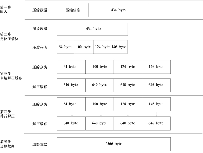 该方案的特点是允许选择不同压缩算法, 为将来拓展更高效率的算法保留空间, 比如合理分块的PARDC等算法, 若采用bzip2程序的压缩算法, 在压缩时, 可以获得和pbzip2等同的性能; 在解压时, 可以省去类似pbzip2对文件进行扫描的消耗时间, 压缩文件仅比bz2文件多一个可忽略大小的压缩信息。图 4流程图举例说明了压缩的处理过程: 假设原始雷达基数据的大小是2566 byte, 被划分为4块, 则前3块数据的大小均为640 byte, 第4块数据的大小为646 byte, 假设经过压缩后4个数据块大小依次为64、100、124和146 byte, 压缩后的总数据量为4块之和(434 byte), 并将压缩信息作为文件头附加在压缩数据的前方。解压(图 5)与压缩的处理过程相反, 通过文件中附带的压缩信息能够并行处理时快速定位数据和申请空间, 方便快速解压。