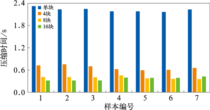 4.1 压缩/解压测试根据CPU支持的线程数上限, 分块数量分别设置成1、4、8和16块, 根据上文设计的压缩/解压方案进行测试。从压缩和解压结果来看, 分块数量对处理效率有着较大的影响。当分块数量达到16块时, 数据的压缩时间平均能减少到单个线程的1/5以下(图 7), 数据的解压时间平均能减少到单个线程的1/8以下(图 8), 部分的数据压缩耗时在8块和16块时相差不大, 甚至有所倒置, 有可能是数据本身压缩率问题或者其他程序运行干扰问题, 从样本的对比来看, 16块时能够在24核CPU上取得较为理想的加速效果。