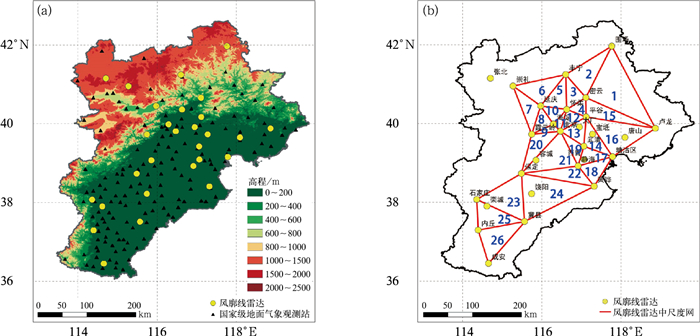 图 1 京津冀地区(a)国家级地面气象观测站、风廓线雷达和地形(填色)分布, (b)风廓线雷达组网 注: 图b中数字1~26分别表示三角形T1~T26, 下同。 Fig. 1 (a) Distribution of national meteorological observation stations, wind profile radar and topography (colored), (b) wind profile radar network in Beijing-Tianjin-Hebei Region |