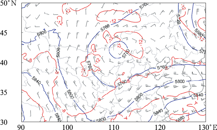 图 2 2024年7月1日08:00 500 hPa位势高度场(蓝色等值线, 单位: gpm)、温度场(红色等值线, 单位: ℃)和风场(风羽) Fig. 2 Geopotential height (blue contour, unit: gpm), temperature (red contour, unit: ℃) and wind field (barb) at 500 hPa at 08:00 BT 1 July 2024 |