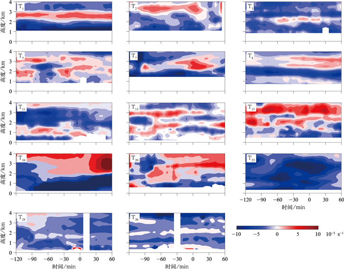 以三角形T23为例, 在降水前120 min内, 从近地层至4 km高度表现为持续的辐合上升运动; 降水前60 min开始2 km以下的辐合迅速增强; 降水前30 min开始, 水平散度值小于-5.0×10-5 s-1, 2~4 km维持深层强辐合, 最强烈的辐合发生在3 km高度处, 水平散度值维持在10-4 s-1量级, 虽然垂直速度大于-0.1 Pa·s-1(图略), 但仍为后续雷暴的形成提供了上升运动条件。此外, 增强的南风加强了风场的水平旋转, 在1 km高度附近处出现相对涡度最大值(约为3.0×10-4 s-1)(图略), 这种气旋式结构也有利于对流组织的发展。