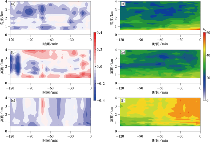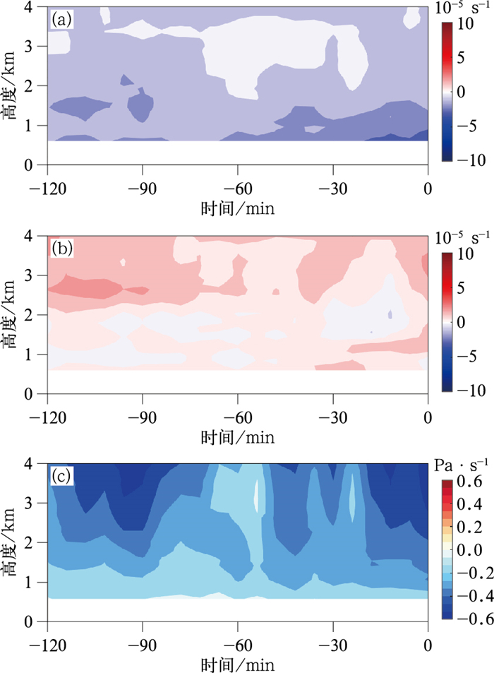 进一步地, 图 6a给出了降水前120 min内不同高度水平散度的变化。在近地层(1 km以下), 水平散度表现为持续的辐合加强, 即由前120 min的-0.4×10-5 s-1到降水开始时刻的-2.6×10-5 s-1, 其变化率为-1.1×10-5 s-1·(60 min)-1。在1~2 km高度处, 水平散度同样地表现为辐合加强, 由前120 min的-0.2×10-5 s-1到降水开始时刻的-1.0×10-5 s-1, 其变化率为-0.4×10-5 s-1·(60 min)-1, 但要比近地层的辐合强度弱些。在2~3 km和3~4 km处, 水平散度虽然也呈现出了弱辐合, 但变率较小。