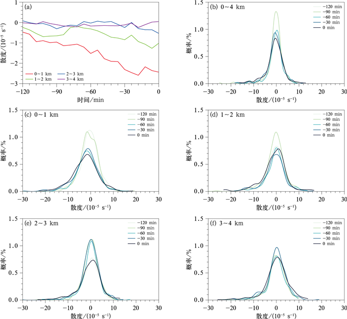 由不同高度的水平散度概率密度分布可见, 水平散度呈现出近似正态分布(图 6b)。同样, 降水前30 min内, 1 km以下辐合运动加强(图 6c), 而在2~3 km和3~4 km处, 辐散运动加强(图 6e, 6f)。