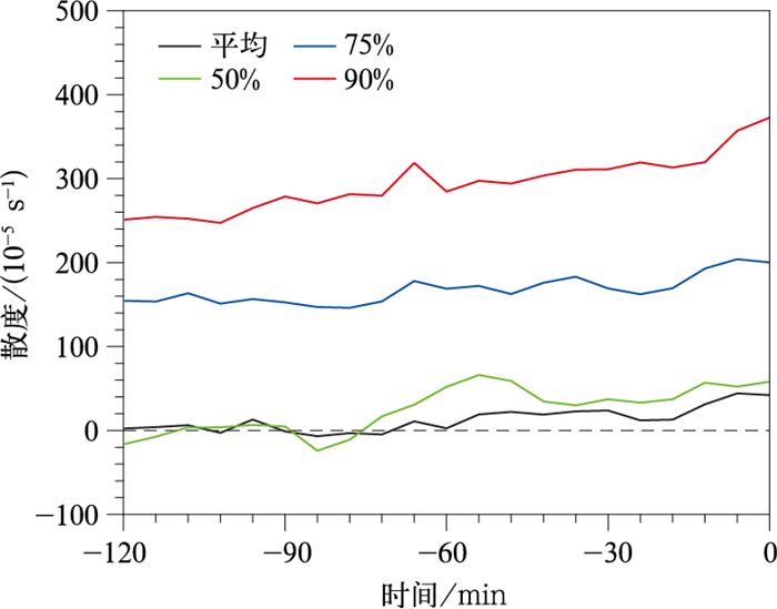 2.2 对流触发信号判别指标特征由上文可知, 持续加强的低层辐合上升运动可以较好地指示对流事件的发生(黄玥等, 2024; Huang et al, 2024), 可以由水平辐合强度定量地分析对流触发信号演变特征。图 7给出了对流触发前水平辐合强度不同分位数的时间序列。水平辐合强度平均值在降水前60 min内为正值, 且在降水前30 min内逐渐变大, 其值可达50×10-5 s-1, 表明辐合运动持续增强, 同时, 50%、75%和90%分位数的水平辐合强度值也表现为持续增加趋势。因此, 可将降水前30 min内水平辐合强度持续大于50×10-5 s-1作为对流触发的判别指标。
