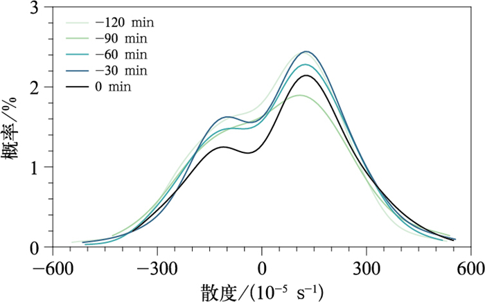 图 8给出了降水前不同阶段2 km以下水平辐合强度的概率密度分布。可以看到, 在降水前30 min内水平辐合强度变大, 表明低层水平辐合、中高层辐散运动加强, 更有利于对流的触发。