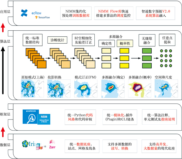 2.2 统一、规范及模块可扩展的智能数字天气预报通用技术框架智能数字天气预报的时空分辨率及更新频次的迅速发展,对底层预报技术算法的数据结构、调度框架、计算存储方法等提出更高要求。同时,随着新应用场景需求不断快速涌现,传统单场景预报技术建模在维护及可复用性方面面临的困难越来越多。为此,构建了统一的智能数字天气预报通用技术框架——国家级多模式集成预报技术框架(National Integration of Multiple Models,NIMM)。该技术框架具有集约化、模块化、标准化特点。