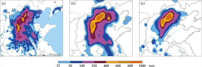图 2 2023年“23·7”华北强降水过程7月29日至8月1日累计降水量(a)实况与(b,c)NIMM滚动更新的提前(b)84 h和(c)72 h预报 Fig. 2 Comparison between the observed accumulated precipitation during the heavy precipitation process in North China from 29 July to 1 August 2023 and the forecast by NIMM (a) observation, (b) forecast with 84 h lead time, (c) forecast with 72 h lead time |