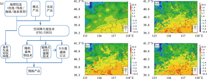 图 5 降尺度精细预报(a)技术路线及(b~e)应用示例: 6 h预报时效的2024年12月24日14时2 m气温(b)ECMWF-IFS预报,(c)5 km分辨率降尺度精细化预报,(d)1 km分辨率降尺度精细化预报,(e)1 km分辨率CLDAS多源融合实况产品 Fig. 5 (a) Technical route and (b-e) application case of downscaling refined forecasting: 2 m temperature forecast with 6 h lead time at 14:00 BT 24 December 2024 (b) ECMWF-IFS forecast, (c) refined forecast with resolution downscaled to 5 km, (d) refined forecast with resolution downscaled to 1 km, (e) a fusion product of multi-source observations from the CLDAS data with 1 km resolution |