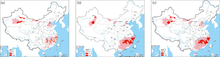 图 7 高温预警预报示例:24 h预报时效的2024年7月10—11日最高气温(a)智能数字天气预报,(b)预报员落区预报,(c)主客观融合预报 Fig. 7 Fusion forecast case of high temperature process: maximum temperature forecast with 24 h lead time in 10-11 July 2024 (a) intelligent digital weather forecasting, (b) forecasters' subjective forecast, (c) fusion of objective-subjective forecasts in the corresponding time period |