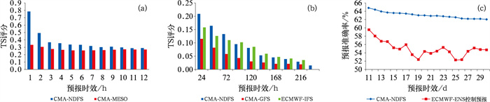 图 8 2023年全年平均的智能数字降水预报与模式对比(a)0.1 mm/3 h量级降水预报TS评分,(b)50 mm/24 h量级降水预报TS评分,(c)24 h晴雨预报准确率 Fig. 8 Comparison and verification of the average intelligent digital precipitation forecasts for the whole year of 2023 and the model predictions (a) TS score for 0.1 mm/3 h precipitation, (b) TS score for 50 mm/24 h precipitation, (c) forecast accuracy for the 24 h clear/rain |