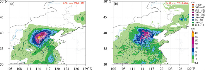 图 9 “23·7”华北强降水过程2023年7月30—31日累计降水量实况(圆点) 与提前36 h预报(填色)对比(a)CMA-NDFS,(b)ECMWF-IFS Fig. 9 Comparison between the observed accumulated precipitation (dot) from 30 to 31 July during the extremely heavy rainfall process in Juy 2023 and the forecast with 36 h lead time (colored) (a) CMA-NDFS, (b) ECMWF-IFS |