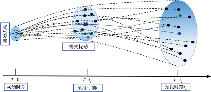 经过多年研究,到20世纪80年代中后期,集合预报的可行性和价值逐渐被认识。集合预报一般是指针对同一预报时刻,针对初始状态或模型方案进行多次扰动试验,从而得到一组不同的预报结果集合(图 1)。通过对这些集合成员结果的离散性和一致性进行统计分析,可以估计预报的不确定性范围并提高预报产品的可靠性。1985—1992年,欧洲中期天气预报中心(ECMWF)和美国国家环境预报中心(NCEP)率先开展了集合预报模型的科学试验,并于1992年12月几乎同时将全球集合预报系统投入业务运行。例如,ECMWF于1992年建立了基于奇异向量(SV)扰动的全球中期集合预报系统(Buizza and Palmer, 1995),而NCEP同期发展了基于繁殖增量(BV)的方法,用于生成初始集合成员(Toth and Kalnay, 1993)。这些开创性工作标志着集合预报由理论走向业务应用。