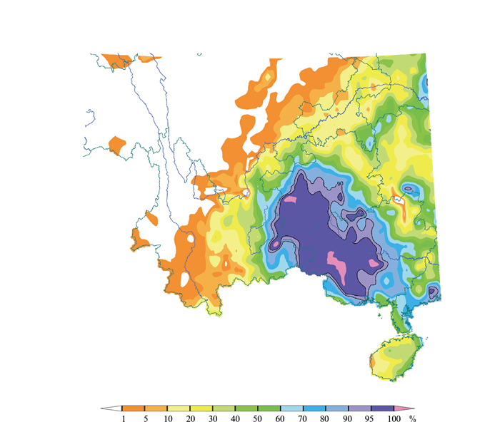 图 2 华南地区2025年9月25日08时至26日08时24小时累计降水≥10 mm的集合概率预报分布(起报时间为2025年9月25日20时,预报时效为0~24小时) Fig. 2 Distribution of the probabilistic forecast of 24 h accumulated precipitation ≥ 10 mm from 08:00 BT 25 to 08:00 BT 26 September 2025, initiated at 08:00 BT 25 September with 0-24 h forecast lead time in South China |