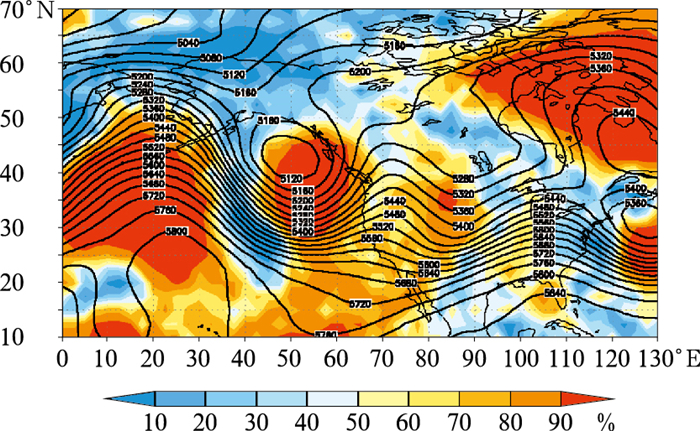 图 5 2011年4月13日00时(世界时, 初始时刻为8日00时)500 hPa高度5天预报的集合预报平均场(等值线,单位:gpm)和可预报性相对度量(填色) Fig. 5 The ensemble mean forecast field of 5 d geopotential height forecast (contour, unit: gpm) and the relative measure of predictability (colored) at 00:00 UTC 13 April 2011, initiated at 00:00 UTC 8 April |