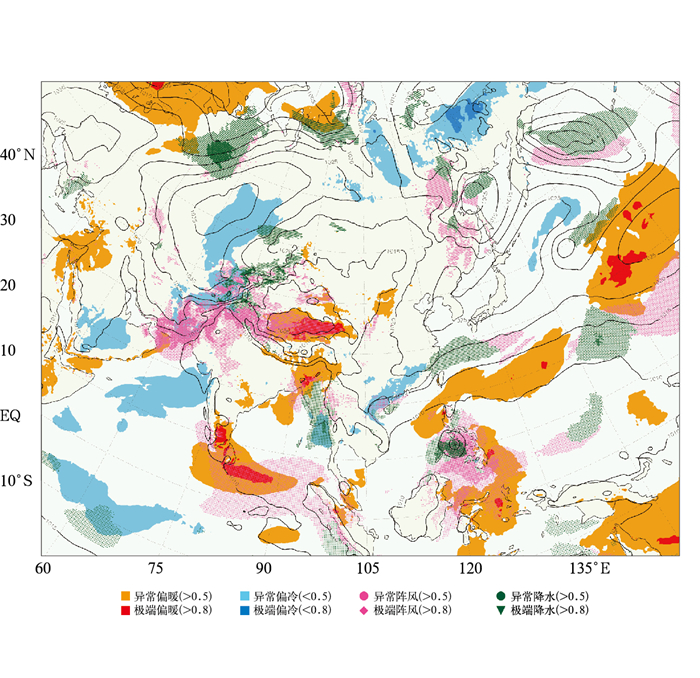 图 6 2025年11月4日08时至5日08时(2日08时起报, 预报时效为第48~72小时)中国及邻近地区的集合数值模式极端天气指数预报产品空间分布 注:黑色等值线为同期海平面气压, 单位:hPa。 Fig. 6 Spatial distribution of extreme weather index forecast products of ensemble numerical models in China and its neighboring regions from 08:00 BT 4 to 08:00 BT 5 November 2025, initiated at 08:00 BT 2 November with 48-72 h forecast lead time |