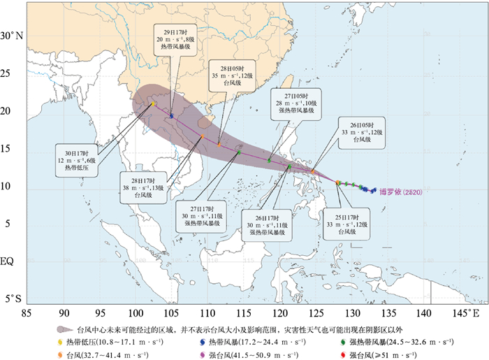 图 7 2025年9月25日18时发布的2025年第20号台风“博罗依”未来120小时路径概率预报 注:紫线表示台风“博罗依”的实况路径,紫色阴影表示未来路径的不确定性区域(概率分布),同时标注各主要时刻的中心位置预报。 Fig. 7 Probability forecast of the 120 h track of Typhoon Bualoi issued at 18:00 BT 25 September 2025 |