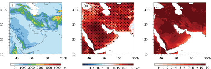 图 1 1951—2021年西亚(a)地形,(b,c)陆面温度(ERA5)的(b)线性趋势和(c)标准差 注:打点区域通过0.05显著性水平检验。 Fig. 1 (a) Topography, and (b) linear trend and (c) standard deviation of land surface temperature in West Asia during 1951-2021 based on ERA5 data |