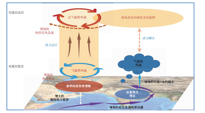 最近,越来越多研究关注前期春季西亚陆面热力异常对印度季风降水的影响。观测表明,春季西亚地区正以0.5℃·(10 a)-1的速度升温,西亚增暖能促使低空急流不断北移,造成巴基斯坦等印度季风边缘区的夏季降水增多,洪涝风险随之增加(Li et al,2023)。此外,西亚增暖也有利于增强季风槽及印度北部的水汽辐合和上升运动,并能激发对流层高层反气旋性异常环流,促使热带东风急流增强和南亚高压西伸北进;初夏,印度北部上空增强的南亚高压与中低层气旋性异常环流动力耦合,降水随之偏多(Yang and Chen, 2022; 图 3)。