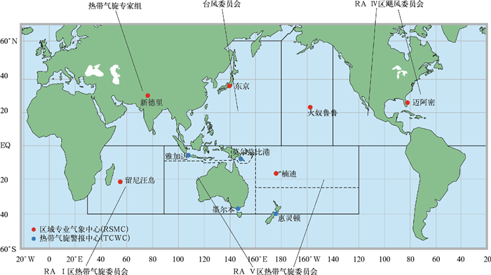 图 1 WMO框架下的五个热带气旋委员会2) Fig. 1 The area of the five WMO regional tropical cyclone committees |