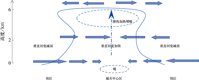 图 1 城市热岛中尺度对流系统形成初期的概念模型(孙继松等,2006) 注:实线为云团廓线。 Fig. 1 Conceptual model of initial stage of mesoscale convective system in urban heat island (cited from Sun et al, 2006) |