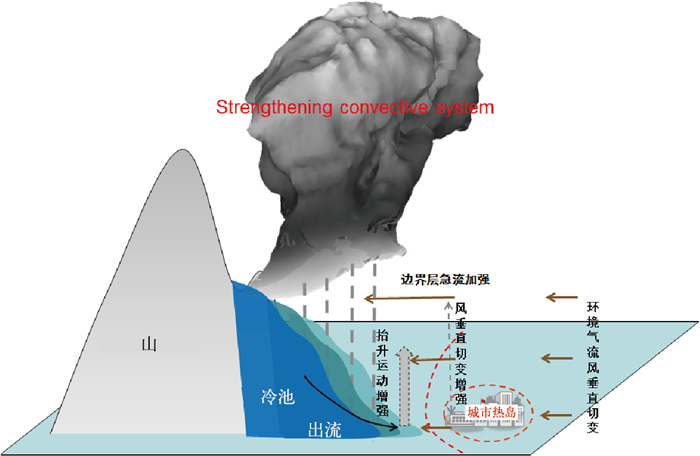 在城市热岛环流和地形环流相互作用方面,孙继松和杨波(2008)讨论了地形与城市热岛共同作用下的β中尺度暴雨的一系列理论特征,指出了城市热岛强度、地形坡度以及城市边沿与地形之间的水平距离对北京西部山前暴雨的影响机制:一方面,地形越靠近城区,山前的水平温度梯度越大,这种城市热岛边沿形成的强温度梯度增强了山前的低空风垂直切变,这是维系中尺度对流降水发生、发展的重要条件;另一方面,一旦迎风坡出现局地强降水,冷池效应不仅强化了山前的辐合抬升强度,有利于中尺度对流系统的维持,而且冷池与城市热岛效应将进一步强化水平温度梯度,而对流层中层由于潜热释放形成相反的水平温度梯度,其共同作用将造成低空风垂直切变与降水强度之间的正反馈现象,这种正反馈过程对β中尺度暴雨的形成过程起到了重要作用,其物理概念模型如图 2所示(改绘自孙继松和杨波,2008的论文)。