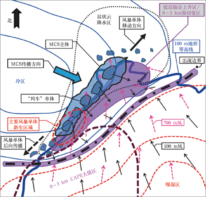 中尺度对流系统中的“列车效应”和风暴单体的后向传播是华北特大暴雨中一类典型特征,大范围的暴雨过程中比较常见,一般与低空急流相联系(孙继松等,2015)。陈明轩等(2013)在研究2012年“7·21”北京特大暴雨过程中发现(图 3),孤立单体首先在地形作用下被触发,并沿低空急流方向移动,其传播前沿为地形强迫与低层风辐合造成的深厚辐合区,对流单体得以发展和维持,形成深对流风暴;由于其后部依然存在穿过对流有效位能大值区、吹向山体和出流边界的暖湿气流,新生单体不断出现,出现风暴单体的后向传播现象;这些风暴单体在深厚且相对稳定的急流作用下,形成了高度组织化的中尺度对流系统,由于中尺度对流系统整体上向东移动缓慢,形成了山前特大暴雨中心。