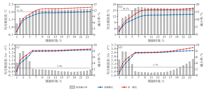 图 10 睿思系统采用多源模式融合背景场及单一模式(CMA-BJ)背景场的(a)温度,(b)相对湿度,(c)10 m平均风,(d)阵风预报检验 注:实时并行测试时段为2023年7月16日至10月6日,右纵坐标对应的灰色柱状为多源模式相对于单一模式实时产品的误差减小率,虚线表示0~24 h平均的误差减小率。 Fig. 10 Comparative tests of (a) temperature, (b) relative humidity, (c) average wind at 10 m, and (d) gust from the RISE system based on multi-source and single (real-time service, CMA-BJ) model backgrounds from 16 July to 6 October 2023 |