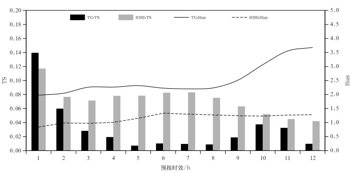 图 13 2024年京津冀雷暴大风(风速≥17.2 m·s-1)个例客观检验评分 注:TG表示基于TG-TransUnet雷暴大风短时临近预报模型的雷暴大风分类预报产品,RISE表示基于多源数据融合的动力-统计协同阵风预报产品。 Fig. 13 Objective verification scores for thunderstorm gale (wind speed ≥ 17.2 m·s-1) cases in the Beijing-Tianjin-Hebei Region in 2024 |