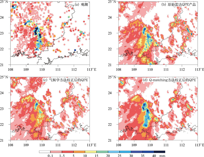 2 新技术发展和集成 2.1 格点降水融合分析偏差订正技术雷达定量降水估测(QPE)是睿思系统降水融合预报的重要数据源之一。然而,由于雷达探测本身特性及地物杂波、虚假回波、QPE计算等多种因素影响,虽然在生成QPE之前已经开展了一系列雷达数据质量控制处理和算法优化,但数据依然会存在一定误差(Schröter et al, 2011; Zhang et al, 2020; Ryzhkov et al, 2022)。因此,在将雷达QPE与其他数据源进行融合之前,需对其进行二次误差订正,其中一种常见的做法是Q-matching方法(Song et al, 2021)。该方法是通过比较雷达QPE和地面AWS观测降水的概率分布函数,将一种数据源视为正确的,从而对另一种数据源进行校正(Rabiei and Haberlandt, 2015)。主要包括以下两个步骤:首先,对AWS观测的1 h降水量及其对应的QPE数据进行概率分布拟合,以建立两者的统计关系。其次,利用AWS数据的累积分布函数(CDF)的逆函数,从AWS数据的CDF中估计QPE数据(即需要校正的数据源)的分位数。在假设AWS能够提供准确降水信息的前提下,由AWS数据确定的降水分布与从QPE数据获得的降水分布应当是基本一致的。基于此假设,Q-matching方法的QPE数据校正方法可以表示为:
