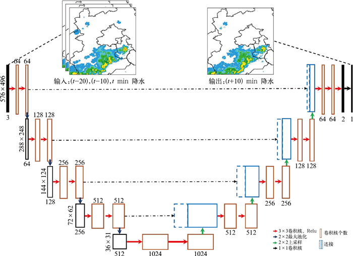 图 5 深度学习网络模型RainNet结构图(曹伟华等,2022) 注:左侧和右侧实心黑框分别为输入层和输出层,空心黑框为卷积输出层。 Fig. 5 Illustration of the RainNet deep learning architecture (cited from Cao et al, 2022) |