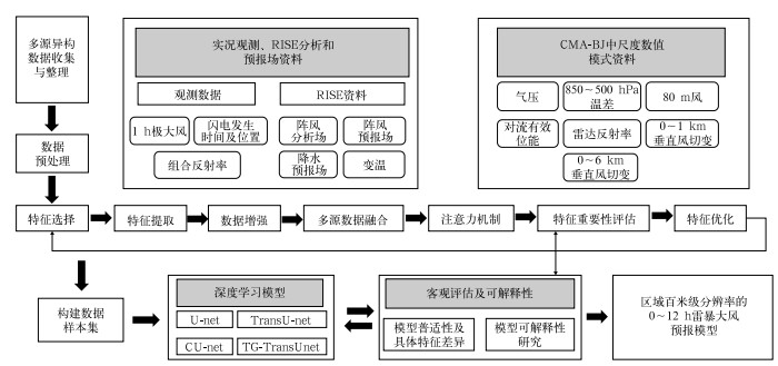 图 8 雷暴大风短时临近预报模型技术框架 Fig. 8 Technical framework of thunderstorm gale nowcasting model in the RISE system |