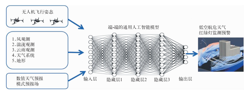 围绕低空安全飞行对气象条件预警的高要求,破局的关键在于发挥现有气象基础设施、无人机载气象遥感装备、无人机飞行姿态和人工智能的协同效能,构建端-端的低空航危天气通用人工智能模型。一方面,依托我国拥有的全球最密集地基垂直观测网络(覆盖风廓线雷达、GNSS/MET水汽站等),构建多源数据同化与物理嵌入AI融合架构,例如利用图神经网络耦合大气运动方程,实现微尺度天气系统的“机理-数据”联合推演(Chen et al,2024),获得低空空域风、云、雨等气象要素观测;另一方面,结合无人机飞行姿态数据,发展无人机集群与微型化传感器协同的低空风切变和湍流智能观测系统,构建基于通用人工智能模型的端-端低空航危险天气预警模型,实现低空非管制空域航路的风切变和湍流秒级预警(图 5)。此类技术路径既可规避高成本雷达布设瓶颈,又能提高预警时效,为低空航路筑造“监测-预测-响应”一体化的低空航危天气红绿灯监测预警防线。