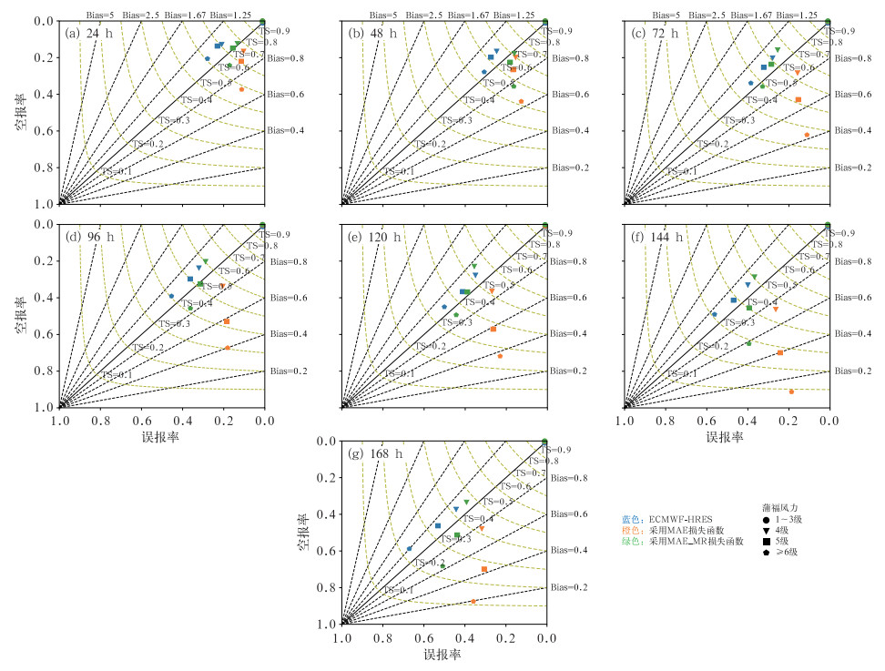 在国家级智能数字预报业务实践中,Yang et al(2023)构建了基于U-Net的10 m阵风偏差订正模型,并提出包含漏报率(MR)约束的MAE_MR损失函数,缓解因强风样本稀缺、误差分布偏态所导致的欠校正或负校正难点。与ECMWF-HRES原始预报相比,引入MR约束的U-Net模型在24~168 h各预报时效上的风速MAE平均降低了22.8%;在≥6级大风情形下预报准确率提升了6.4%,即使在5~6级风速区间仍保持显著增益,明显优于采用传统损失函数(如MAE、均方误差MSE、加权平均绝对误差WMAE)的同构神经网络和随机森林、卡尔曼滤波等方法(杨绚等,2022;孙全德等,2019;Homleid, 1995)。验证结果显示(图 1),融合MR指标约束后,模型的空报率和漏报率组合最优:引入具有明确业务意义的诊断量MR,能够“拉升”强风段的订正强度,同时维持整体误差的系统收敛。这项研究表明,将物理量诊断指标融入损失函数,是面向极端事件和关键阈值的有效路径;配合多源因子融合和时空结构约束的网络设计,可兼顾方法的普适性与业务实用性。