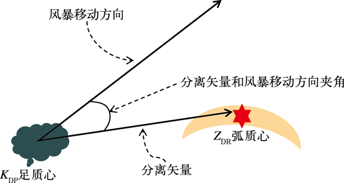图 1 低层KDP足和ZDR弧的质心分离矢量与风暴移动方向夹角示意图(Loeffler and Kumjian, 2018) Fig. 1 Schematic diagram of the angle between the centroids separation vector of the KDP foot and ZDR arc in low level and storm movement direction (cited from Loeffler and Kumjian, 2018) |