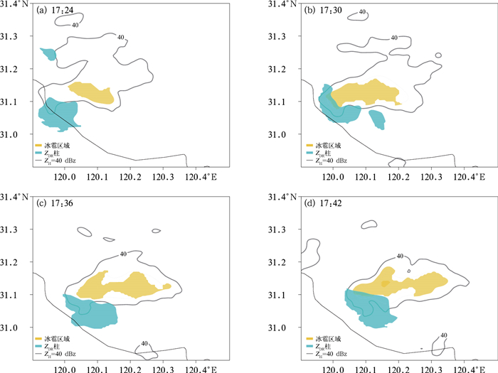 此外,本研究同时发现,非龙卷超级单体中冰雹区域更倾向于向后侧下沉气流处伸展,而龙卷单体中冰雹区域出现在前侧下沉气流区域。2021年5月14日影响苏州盛泽地区的超级单体,初始触发生成于安徽郎溪西南侧,16:54左右已加强为超级单体移入太湖地区,17:50—18:00还未产生龙卷前,先引发了32 m·s-1的雷暴大风。17:24—17:42此超级单体3.5 km等高平面上冰雹区域(图 4黄色区域)不断增大,从75.11 km2增大到187.21 km2,此时风暴移动方向方位角为270°,冰雹区域更倾向于向风暴移动的后侧下沉区域伸展,逐渐靠近并进入ZDR柱(图 4蓝色区域)表征的上升气流区。范围大且向后侧下沉气流区延伸的冰雹区域理论上将产生范围更大的冷区和更强的后侧阵风锋,这将限制通常位于风暴右后侧的超级单体上升气流。
