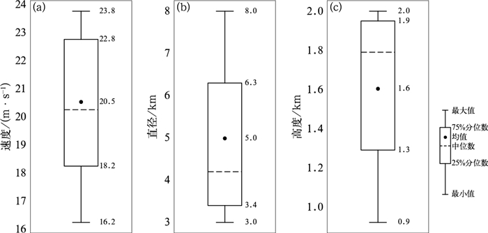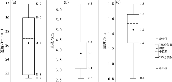 图 8 龙卷发生前6 min低层中气旋箱线图 (a)最大旋转速度,(b)直径,(c)最大旋转速度高度 Fig. 8 Box plots of the low-level mesocyclone 6 min before the occurrence of tornadoes (a) maximum rotational velocity, (b) diameter, (c) height of maximum rotational velocity |