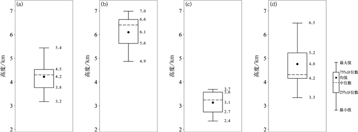 图 9 中层中气旋最大旋转速度高度箱线图 (a,c)龙卷发生前(a)24 min、(c)6 min,(b,d)非龙卷发生前(b)24 min、(d)6 min Fig. 9 Box plots of the height of maximum rotational velocity for the mid-level mesocyclone (a) 24 min and (c) 6 min before the occurrence of tornadoes, (b) 24 min and (d) 6 min before the occurrence of non-tornadoes |