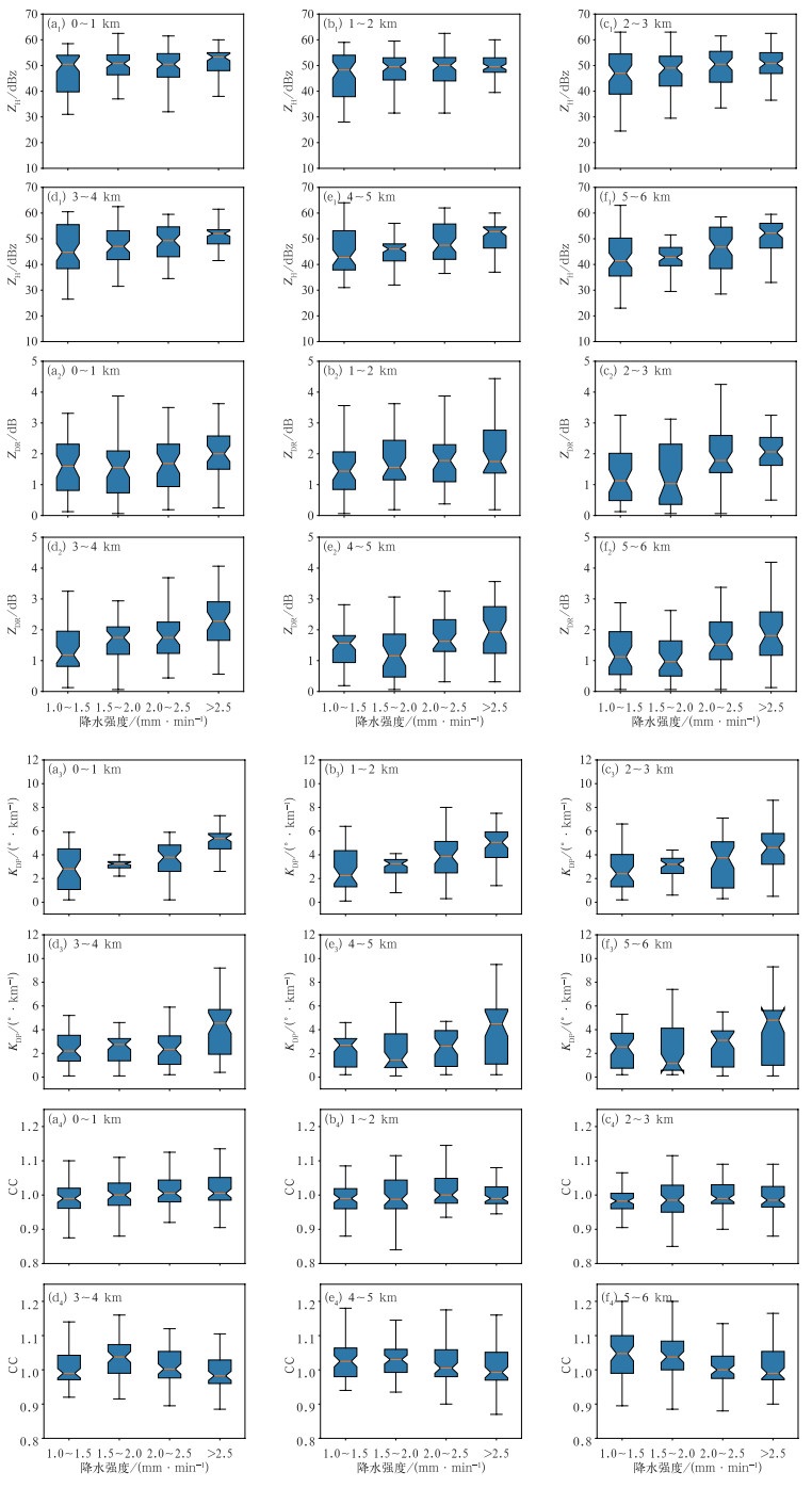 分析各高度的ZDR(图 2a2~2f2),4 km以下中位数和平均值随着分钟降水强度增大而增大,分钟降水强度>2.5 mm·min-1时统计值最大,所有高度上第25%分位值≥1.2 dB,中位数和平均值≥1.8 dB,第75%分位值≥2.4 dB,较1.0~1.5 mm· min-1、2.0~2.5 mm·min-1分别增长13%~220%、4%~67%,出现超强降水时雨滴尺度较大。4 km以上ZDR也较4 km以下减小,表明极端降水发生时大雨滴主要集中在中低层。