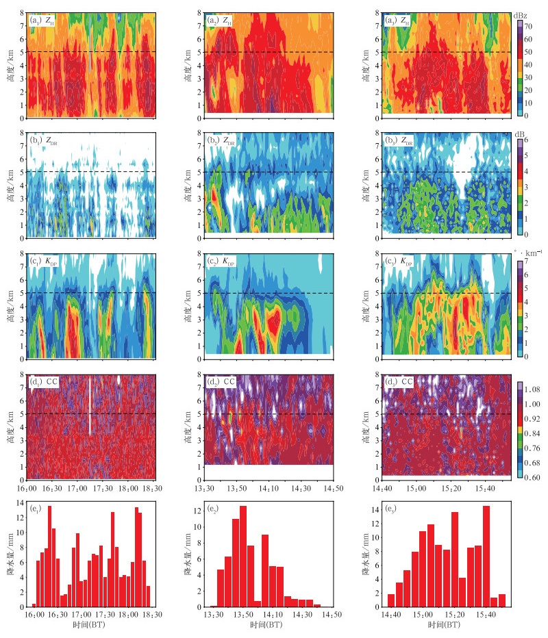 图 7 (a1~e1)2023年7月22日16:00—18:30,(a2~e2)2024年7月12日13:30—14:50和(a3~e3)2024年7月14日14:40—15:55极值点上空X波段相控阵雷达(a~d)双偏振参量ZH、ZDR、KDP、CC的时间-高度演变和(e)逐5 min降水量随时间的变化 注:图中黑色虚线为0℃层。 Fig. 7 (a-d) Time-height evolution of dual-polarization parameters of ZH, ZDR, KDP and CC and (e) 5 min precipitation with time from X-band dual-polarization radar over precipitation extreme point from (a1-e1) 16:00 BT to 18:30 BT 22 July 2023, (a2-e2) 13:30 BT to 14:50 BT 12 July 2024 and (a3-e3) 14:40 BT to 15:55 BT 14 July 2024 |