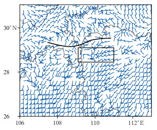 图 12 CMA-SH3 2023年6月29日08:00起报的30日02:00 10 m风场(风羽) 注:黑色粗线代表预报的地面辐合线,方框代表实况暴雨区。 Fig. 12 10 m wind field (barb) at 02:00 BT 30 forecasted by CMA-SH3 model initiated at 08:00 BT 29 June 2023 |