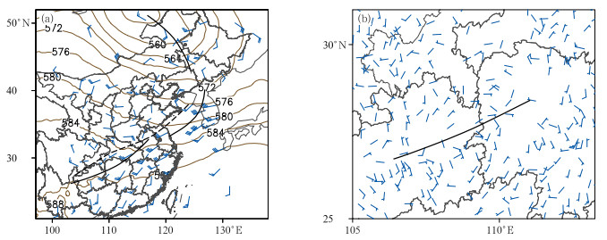 图 2 2023年6月29日20:00(a)500 hPa高度场(等值线,单位:dagpm)和850 hPa风场(风羽),(b)10 m风场(风羽) 注:图a中黑色粗实线为500 hPa槽线,虚线为850 hPa切变线;图b中黑色粗实线为地面辐合线。 Fig. 2 (a) 500 hPa geopotential height (contour, unit: dagpm) and 850 hPa wind field (barb), (b) 10 m wind field (barb) at 20:00 BT 29 June 2023 |