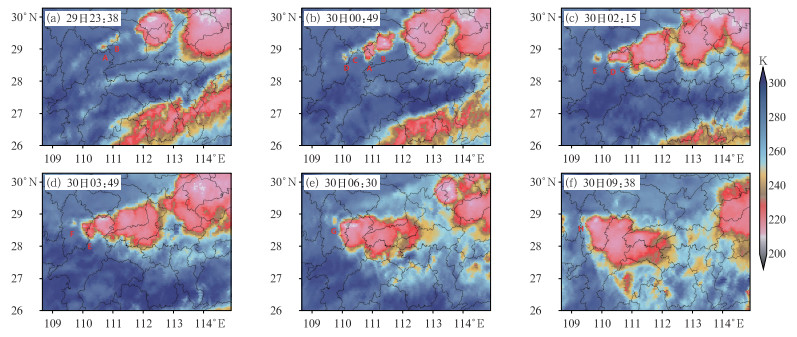 (3) 强对流特征明显:过程期间湖南共出现小时雨强≥20 mm·h-1短时强降水330站次,其中小时雨强≥50 mm·h-1极端短时强降水43站次;短时强降水集中出现在30日00:00—14:00,04:00区域内共出现42站次短时强降水,07:00出现极端短时强降水13站次(图 1d)。