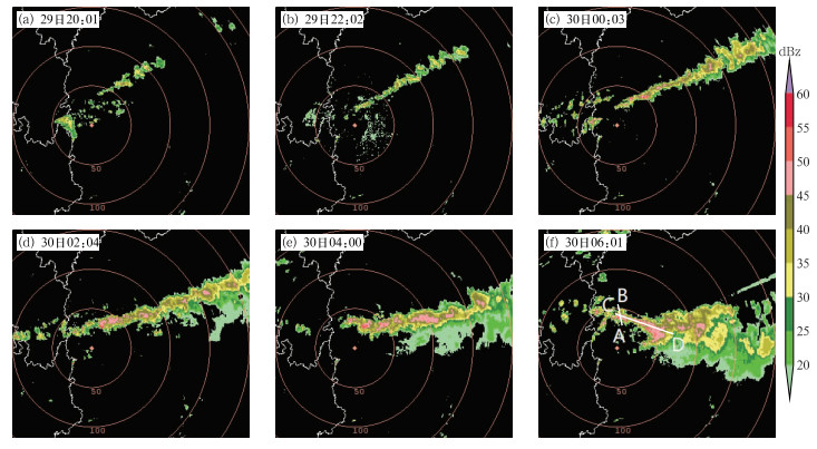 图 5 2023年6月29—30日吉首雷达组合反射率因子演变 注:图 5f中白线CD、AB分别为图 6a和6b剖面位置。 Fig. 5 Evolution of composite reflectivity factor of Jishou Radar during 29-30 June 2023 |