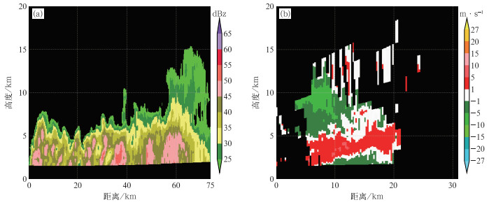 图 6 2023年6月30日06:01沿图 5f白线(a)CD的反射率因子和(b)AB的径向速度剖面 Fig. 6 Cross-section of (a) reflectivity factor along the white line CD and (b) radial velocity along the white line AB in Fig. 5f at 06:01 BT 30 June 2023 |
