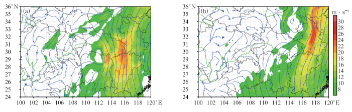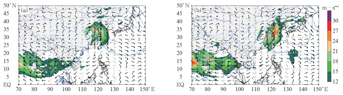 图 11 2024年7月ECMWF(a)28日20:00模式初始场与(b)26日08:00起报的60 h预报时效的850 hPa流场(流线)和风速(填色) Fig. 11 The 850 hPa flow field (streamline) and wind speed (colored) of (a) model initial field at 20:00 BT 28 July and (b) 60 h forecast by ECMWF initiated at 08:00 BT 26 July 2024 |