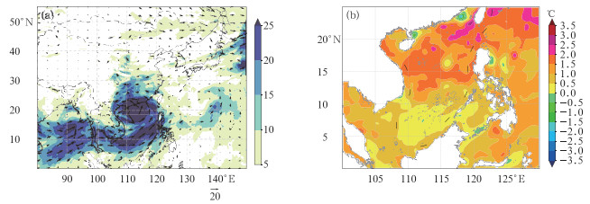 图 13 2024年9月(a)6日08:00 850 hPa水汽通量(箭矢和填色,单位:g·cm-1·hPa-1·s-1),(b)4日海面温度距平 Fig. 13 (a) Water vapor flux (arrow and colored, unit: g·cm-1·hPa-1·s-1) at 850 hPa at 08:00 BT 6 September, and (b) SST anomaly on 4 September 2024 |