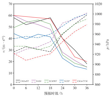 图 14 2024年9月6日20:00中央气象台主观预报(BABJ)、ECMWF、NCEP、CMA-TYM起报的36 h时效预报与相应时刻的中国气象局台风最佳路径(CMA-BT)的台风中心最大风速(实线)和中心附近海平面最低气压(虚线) Fig. 14 A comparison of CMA Best Track (CMA-BT) and 36 h forecasts by BABJ, ECMWF, NCEP and CMA-TYM for maximum wind speed (solid line) and minimum central pressure (dashed line) near the center initiated at 20:00 BT 6 September 2024 |