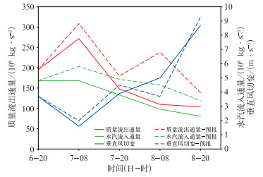 图 15 2024年9月6日20:00 ECMWF起报的36 h预报时效的高层质量流出通量(300~100 hPa)、水汽流入通量(1000~300 hPa)和垂直风切变(850~200 hPa)的预报(虚线)与分析(实线) Fig. 15 A comparison between the forecast (dashed line) and analysis (solid line) of upper-level mass outflow flux (300-100 hPa), moisture inflow flux (1000-300 hPa), and vertical wind shear (850-200 hPa) from ECMWF initiated 20:00 BT 6 September 2024 |